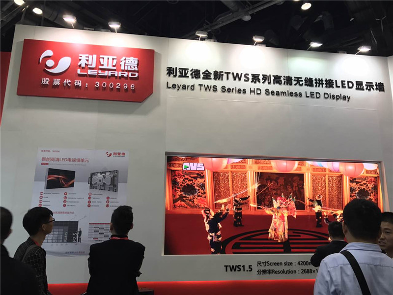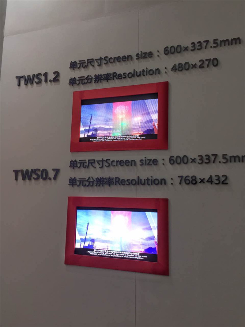 利亞德展出了TW系列高清無縫拼接LED顯示墻,包括TWA0.9(9.6m*2.7m)、TWS1.5(4.2m*1.6875m)、TWS1.2(0.6m*0.3375m)、TWS0.7(0.6m*0.3375m)。
